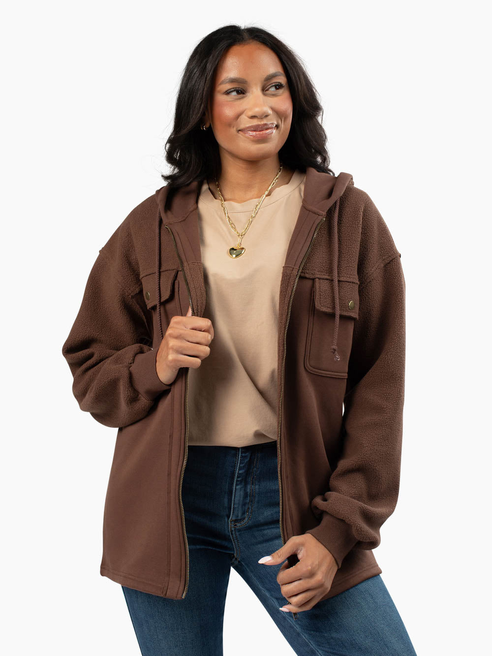 Designed with a longer body length and tall-friendly proportions, Oakley features a roomier silhouette that feels relaxed without going full oversized. The front flap pockets and full front zip keep it functional, while the attached hood adds an extra layer of warmth for breezy days and bonfire nights.
